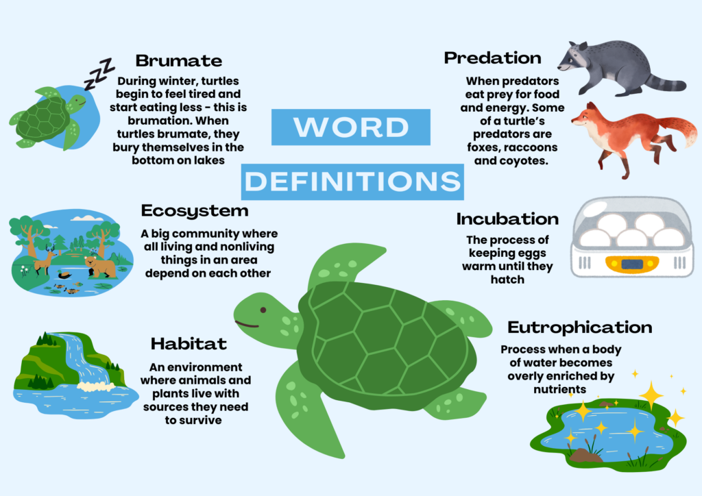 Turtles are often described as the cleaning crew of wetlands. Turtles are scavengers, meaning they eat a lot of dead and decaying matter. By eating this matter, the turtles are removing harmful bacteria from the wetlands, keeping the other animals living in the wetlands healthy.
